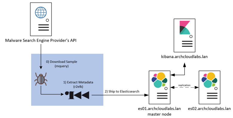 - Run r2elk to extract metadata and run YARA rules against samples.